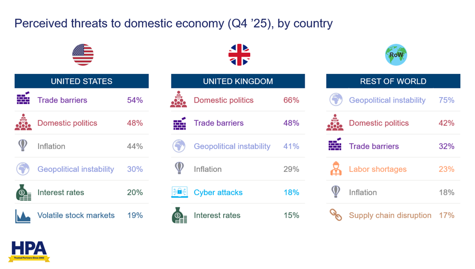 Overall, the biggest perceived threats to national economies are domestic politics (53% say so), geopolitical instability (48%), and trade barriers/tariffs (45%). But the picture differs greatly across countries.