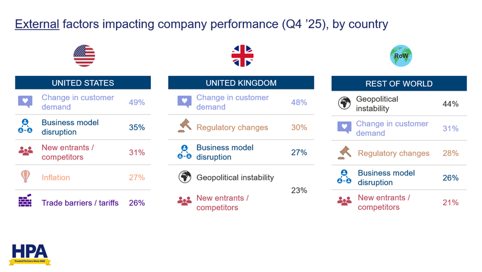 In terms of what will have an impact on business performance, change in customer demand stands out as the most frequently mentioned factor (by 43% of respondents). The next most commonly cited factors, by nearly a quarter of all respondents, are business model disruption, geopolitical instability, regulatory changes, and new entrants, with trade barriers cited by 1 in 5. U.S. and UK respondents are more concerned about changes in customer demand and less concerned about geopolitical tensions compared with those in RoW.