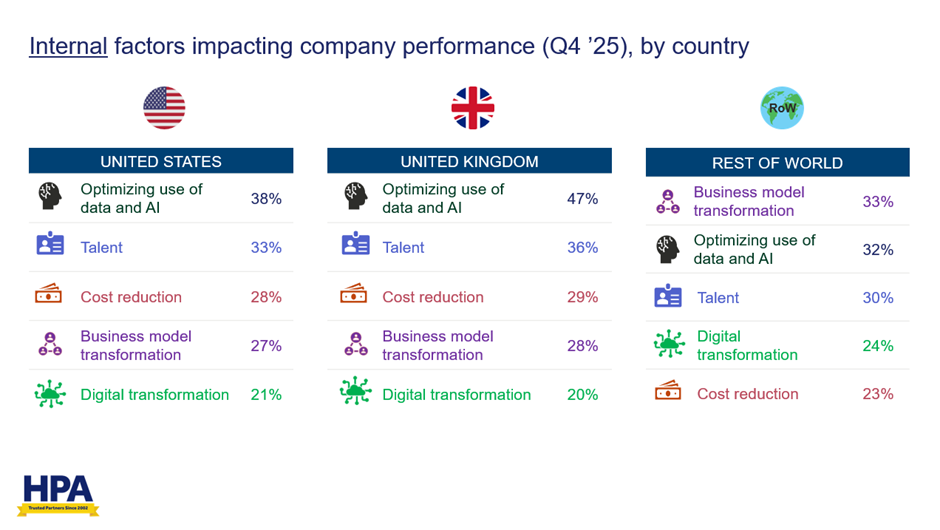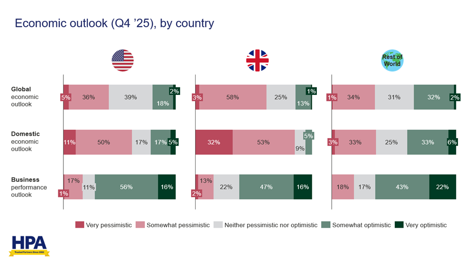 This is a key finding from the HPA Economic and Business Outlook survey, carried out in partnership with Eden McCallum. Over 350 business leaders in the U.S., UK, and the rest of the world were asked for their views on the domestic and global economy and future business prospects. Their varied responses reflect a world that is in a state of flux, but which may also be poised for more rapid growth.
