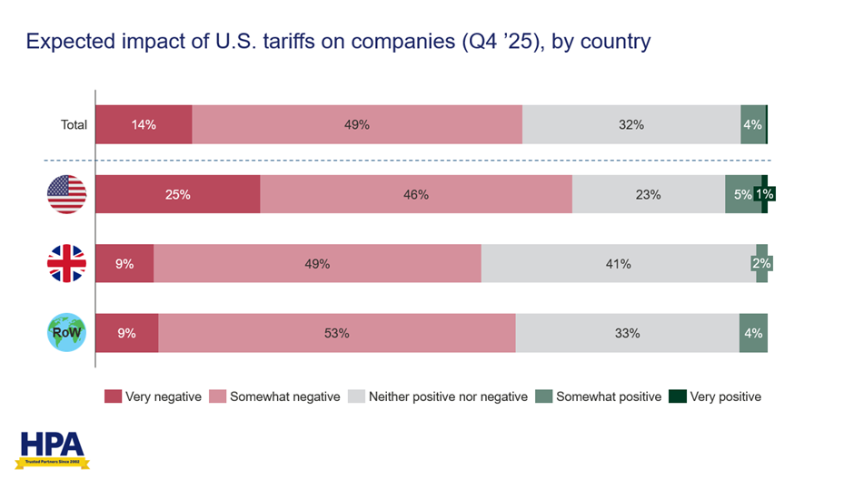 Though the tariff threat has moderated slightly over the past 6 months, pessimism among business leaders still remains. Even where businesses have limited activity in the U.S., nearly two-thirds of business leaders expect tariffs to have a negative impact on their companies. Only 4% of all respondents expect them to have a positive impact.