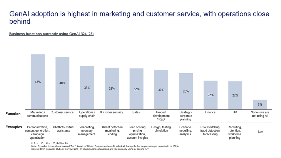 Functionally speaking, the early adopters are marketing and communications (43%), which are using GenAI for content generation, personalization, campaign optimization, and customer service (40%), where chatbots/virtual assistants are the main use case.