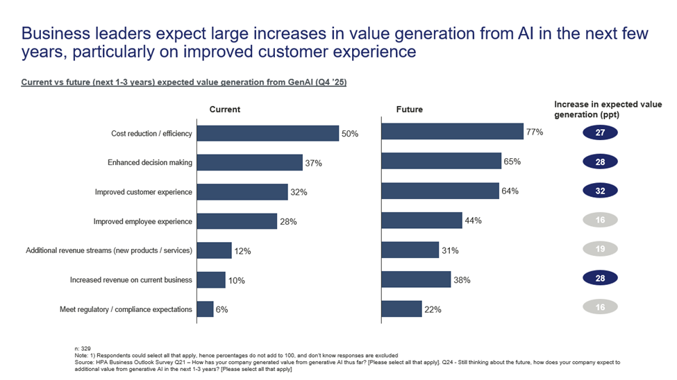 In the next 1-3 years, 80% of leaders expect GenAI to have a ‘significant’ or ‘very significant’ impact on their businesses. This is quite an increase from today’s 33%. In the near-term leaders anticipate increased value generation, especially regarding improved customer experience, as well as cost reduction/efficiency gains, increased revenue, and enhanced decision making.