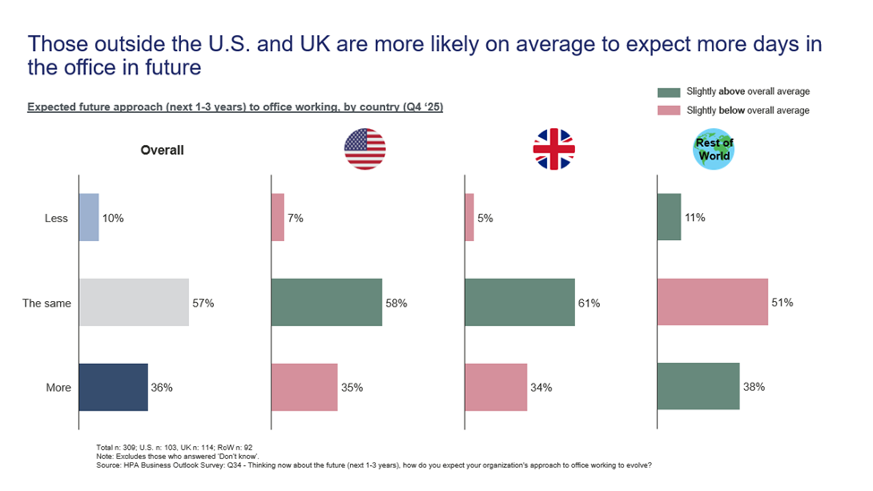Hybrid work continues to dominate ways of working, with nearly 7 in 10 organizations adopting this approach globally. Approximately 10% are still fully office-based and just under 10% fully remote, with the remainder varying their approach “by team”. The U.S. stands out at both extremes, with more fully office-based and fully remote organizations compared to global peers.